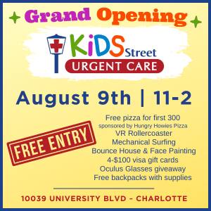 You're invited to the Grand Opening Celebration of KidsStreet Urgent Care on Friday, August 9th from 11 AM to 2 PM at 10039 University Blvd, Charlotte, NC 28213! This is a FREE family-friendly event filled with exciting activities, giveaways, and more. Here's what's in store: